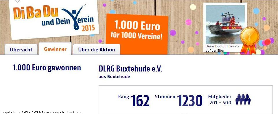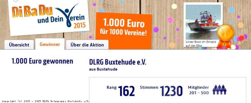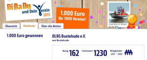 Die ING-DiBa spendet jedes Jahr bei ihrer Aktion "DiBaDu und Dein Verein" 1.000 Vereinen 1.000€. Dieses Jahr haben auch wir es geschafft! Dank der tatkräftigen Unterstützung der Mitglieder, vieler Besucher des Hafen- und Brückenfestes in Buxtehude, sowie vieler weiterer Stimmen ist es uns gelungen am Ende der Aktion mit 1230 Stimmen in der Kategorie mit 201 bis 500 Mitgliedern auf dem 162. Rang zu landen. Einen herzlichen Dank an alle, die uns unsere Stimme gegeben haben!