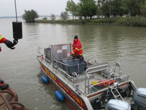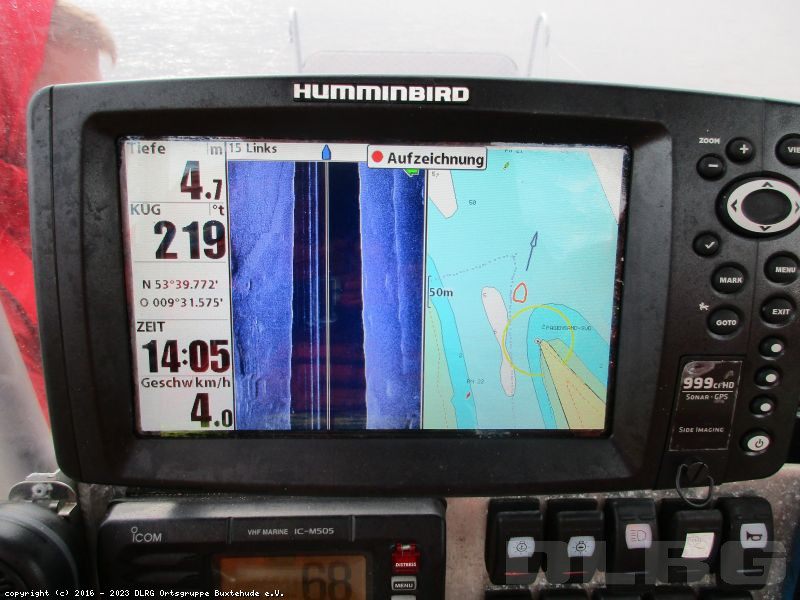 Unsere beiden Boote wurden, neben einem jeweils einem Boot aus Stade, Horneburg und Drochtersen, in die Sonargruppe eingeteilt. Es wurden SD Karten mit Suchbereichen ausgegeben, diese haben wir gemeinsam in die Geräte eingelesen und die Aufnahme gestartet (bei langsamer Fahrt mit hochgetrimmten Maschinen kann man das Sonar in beide Richtungen nutzen) Anschließend sind wir nach Pagensand gefahren und haben unsere Suchmuster (Karo/Schachbrettmuster) abgefahren.