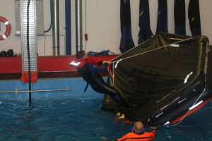 Zum Training der Ausbilder gehörte das Verlassen eines Schiffes durch Sprung ins Wasser, das Verhalten im Wasser als Einzelperson, sowie in der Gruppe, die sicherste Technik im Wasser, um eine Rettungsinsel zu erreichen und das richtige Ausrichten einer Rettungsinsel, falls diese falsch im Wasser liegt, sowie das Einsteigen in diese Insel und das Herausholen mittels einer Seilwinde am Helikopter. Diese Szenarien wurden natürlich nur unter harten Bedingungen, einem simulierten Gewittersturm, geprobt.