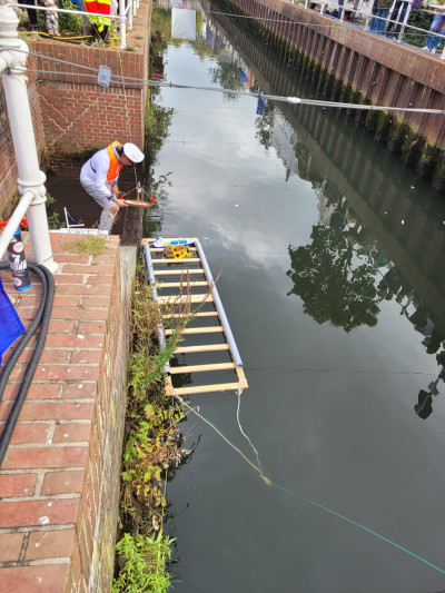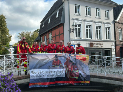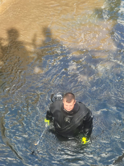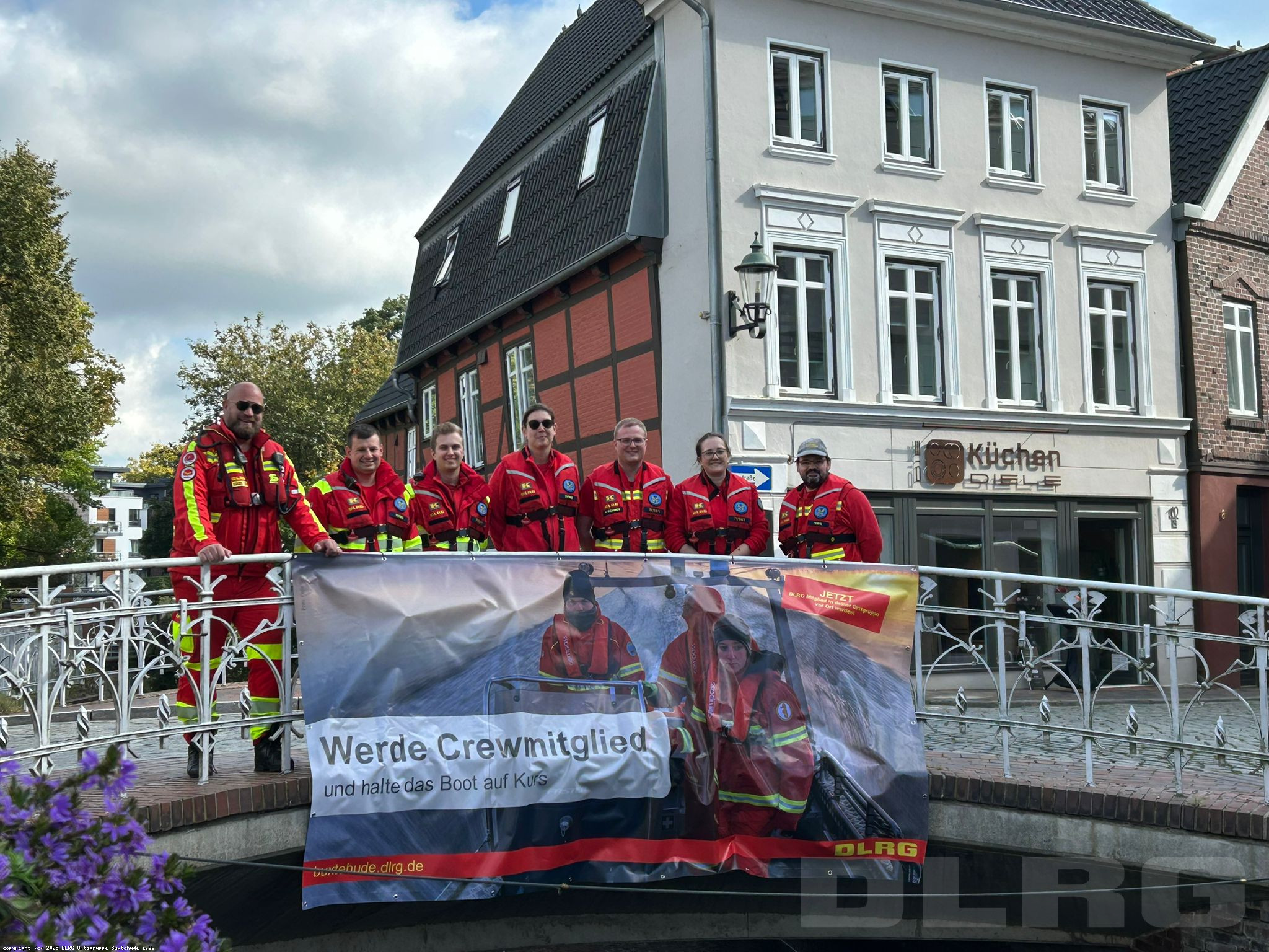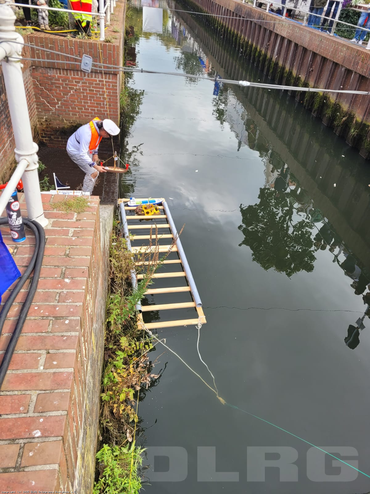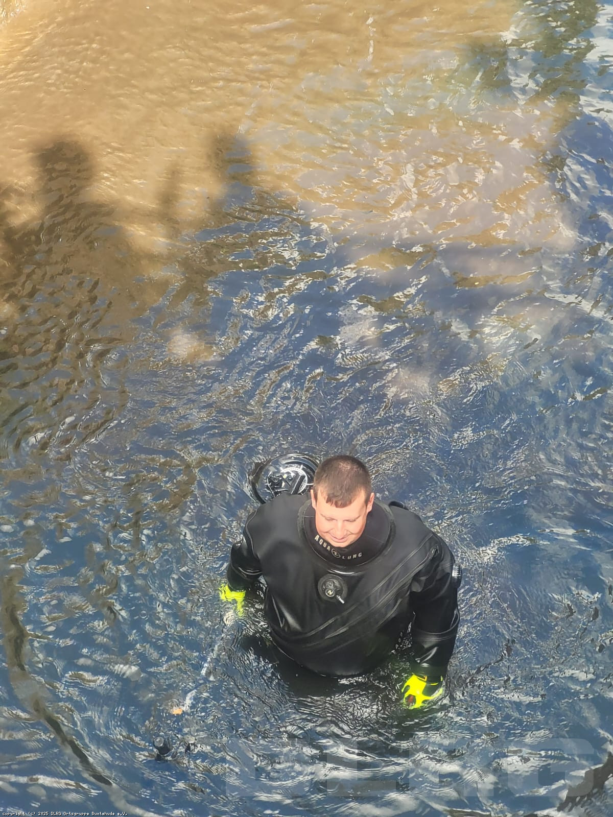 Während die Veranstaltung mit der Siegerehrung ihrem Ende zuging, meldete sich ein Besucher bei uns, dem sein Fahrradschlüssel in den Fleth gefallen war. Glücklicherweise war dieser sichtbar, sodass kurzerhand einer unserer Helfer im Trockenanzug in den Fleth stieg, um den Schlüssel zu bergen.